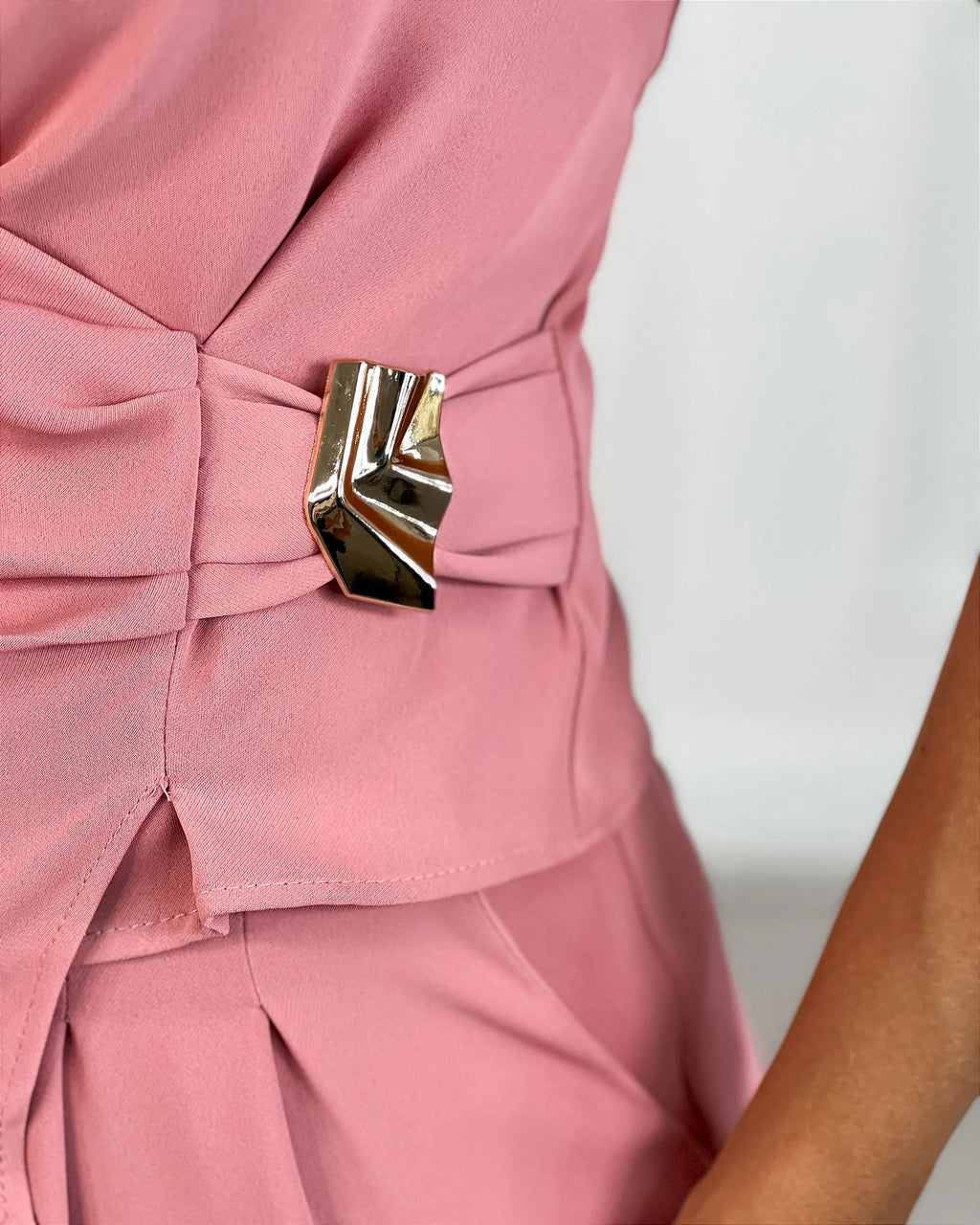 Comprimento na cintura, decote V transpassado, detalhe em drapeados e em fivela metalica dourada na barra frontal, cavada, barra assimetrica, fechamento em zíper lateral.