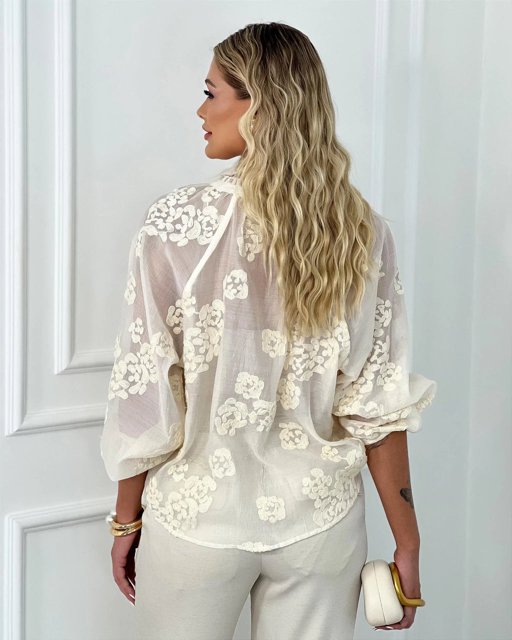 Comprimento alongado, manga longa ampla com punho, gola reconda com detalhe em semi babado, fechamento em botões em perolas e amarração frontal, modelo possui transparencia, rica em bordados em linha, modelo amplo e soltinho.