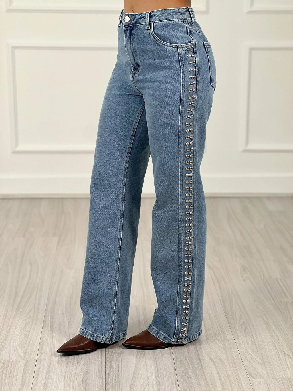 Comprimento alongado, passante, bolso faca lateral, bolso posterior, laterais bordadas a mão em tachas, rica em detalhes de recortes em alto relevo, fechamento em zíper e botão frontal.